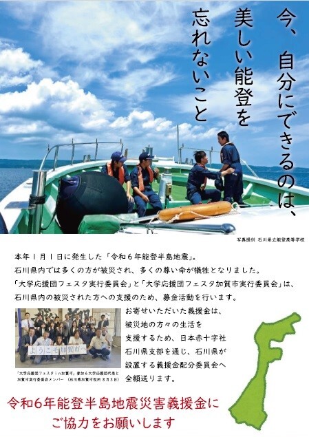 私たちに今何ができるかを考え、東京の大学応援団フェスタ実行委員会の皆様とともに、9月15日には「大学応援団フェスタ2024」の会場・東京都立川市のたましんRISURUホールで、11月17日には加賀市文化会館で「能登半島復興支援募金活動(募金先:日本赤十字社石川県支部)」に取り組み、ささやかながら復興支援に協力します。今、私たちにできるのは、美しかった能登を忘れないことです。また、同日開催する山代温泉観光協会主催の「やましろカニ祭り&九谷焼マルシェ」会場にて、復興支援/能登物産販売をいたします。そして何といっても、参加6大学の応援団の皆様から「がんばろう石川!」の力強いエールを送っていただくことにより、復興に向け日々額に汗されている皆様に少しでも元気と勇気をお届けしたいと思います。