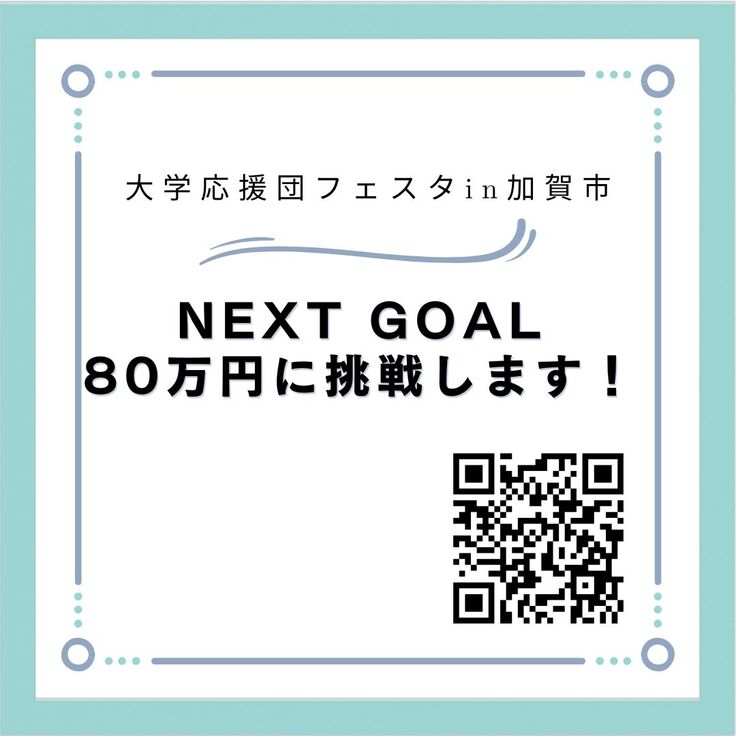 多くの皆様方に温かいご支援をいただき、10月17日(終了14日前)に目標の70万円を達成いたしました。これまでご支援いただきました皆様、本当にありがとうございます。そこで、NEXT GOALを、新たに10万円追加した800,000円に設定させていただきます。10万円を追加させていただく目的は、イベントに協力いただいている加賀市内小中高校生の活動に対する助成をより厚くすることにあります。ステージ発表する加賀高校和太鼓部、加賀市内3高校(大聖寺・大聖寺実業・加賀)吹奏楽部、やましろ学童クラブ代っチ、Let's タップダンスチーム、チアダンスチームSPARKLE、山代中学校大田楽チームや、司会進行役の大聖寺高校放送部、受付・募金活動担当の山代中学校ボランティア部、販売実習を行う大聖寺実業高校商業部、加賀高校商品開発チームの総勢約500人の活動を全面的にバックアップします。