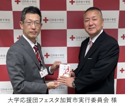 大学応援団フェスタ加賀市実行委員会・実行委員長佐々木和彦より、日本赤十字社石川県支部に、能登半島地震復興支援義援金として、421,889円を寄贈させていただきました。募金活動にご協力いただき、誠にありがとうございました。