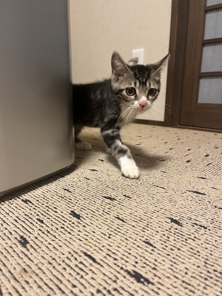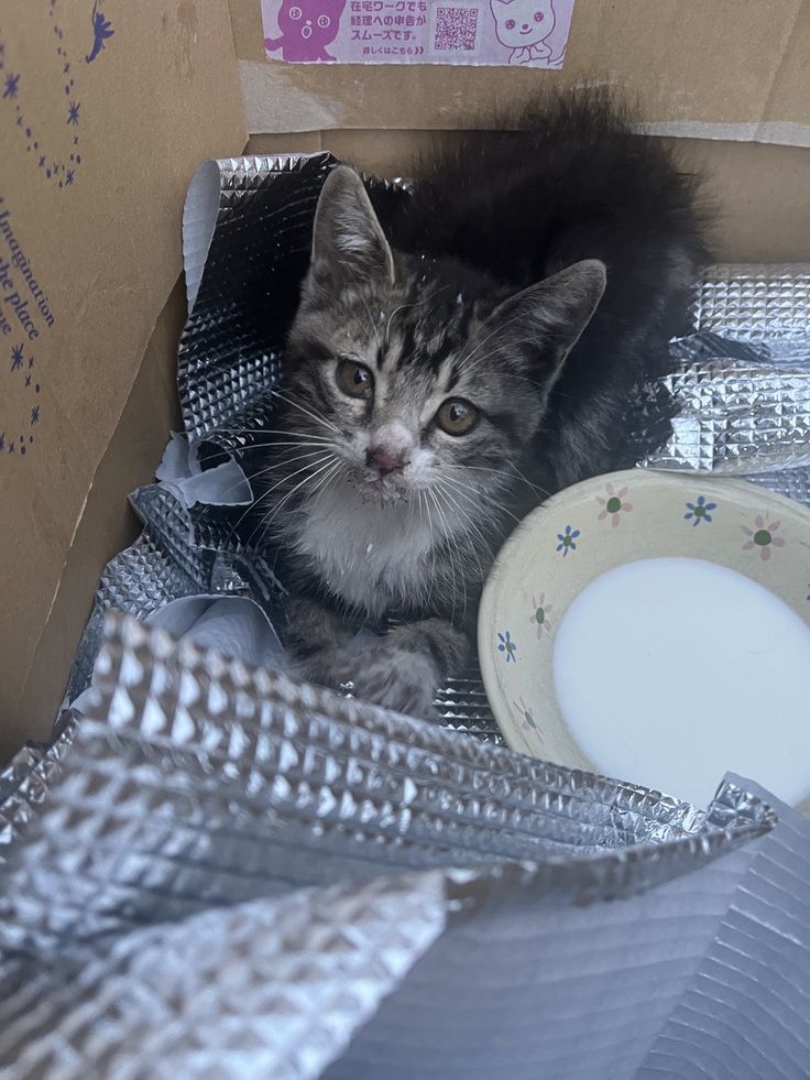 7月8日に身内から「車庫の前に子猫がいて動かない」と連絡があり、向かってみるとその場から動こうともせず震えており、カラスに狙われていたため保護しました。