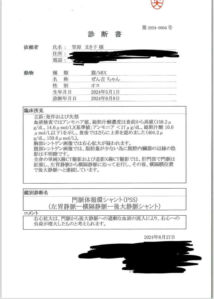 ぜん吉の場合はまだ体が小さい上に肝性脳症の症状が重く、通常の手術よりリスクは高いと思われます。