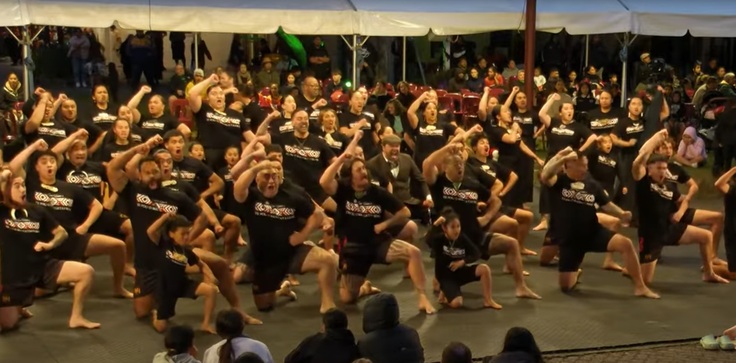 <今年8月にハミルトンで行われたマーオリキングの祝賀会で地域のハカグループがキングと民衆に向け披露したハカ>