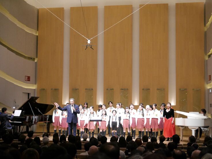 そして、第三部は、子どもたちと金子さんの共演ステージ「新しい星光った」(林光:構成・編曲)をお届けしました。林光氏の編曲により「もみの木」や「もろ人こぞりて」など誰もが知るクリスマスソングが新鮮に感じられる曲集は、子どもたちにとってチャレンジでもありましたが、練習を重ねて段々と自分たちのものにしてきました。当日は金子三勇士さん、そして日頃からお世話になっている野間春美先生が、2台のピアノで子どもたちに寄り添い、時にリードしてくださり、子どもたちはこれまでの成果を発揮することができたのでした。