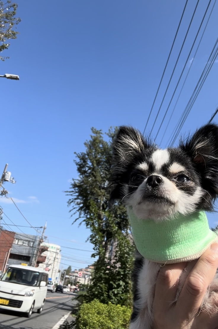 今日は定期診察で病院に行きました🏥予約していた時間より30分早く着いてしまったので、病院の周りをだっこでウロウロ🐕