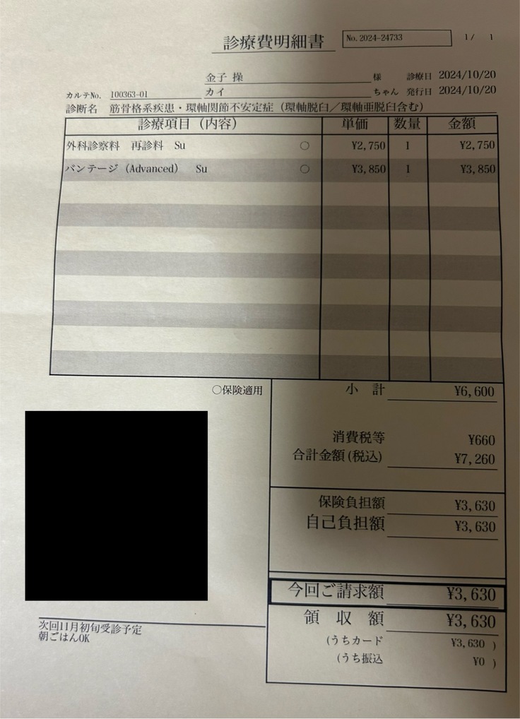 3,630円(10/20診察、首固定バンド)