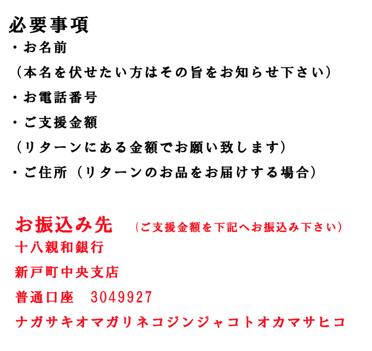※ご入金が確認できましたら、長崎尾曲がり猫神社が代理にて