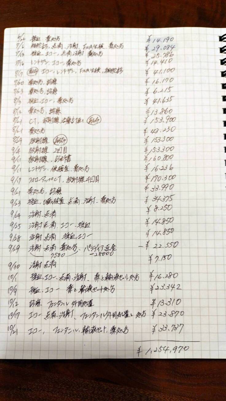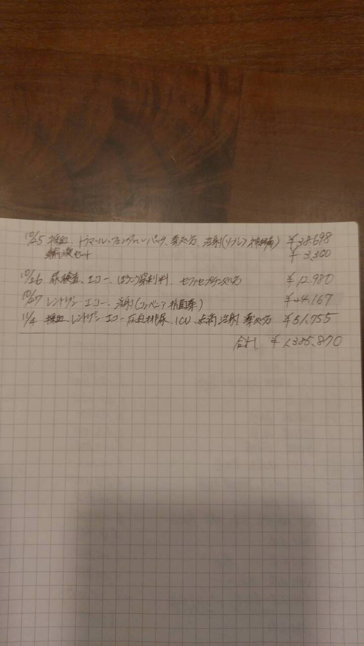 大学病院とかかりつけを受診した日付、大まかな治療内容とかかった費用です。診療明細票は活動報告の受診の報告に写真を掲載しております。