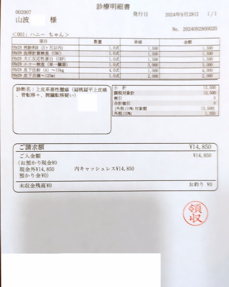 エコーで肺の水溜まってないことを確認、脾臓の腫瘍の大きさも変化なし。