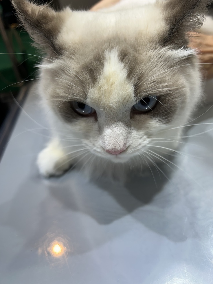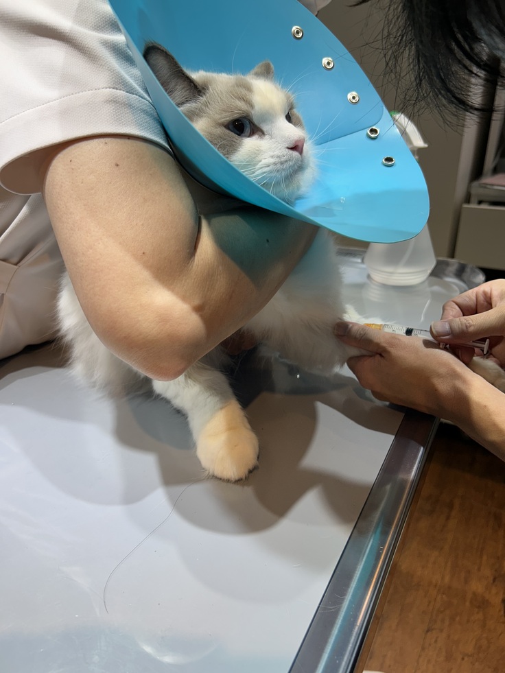 いつも動物病院でも穏やかで社交的な性格のジャンポールが、今回今までにない程怒ってしまったため、獣医さんの判断で、麻酔入りの鎮静薬を注射することになりました。穏やかでおとなしい性格のはずのジャンポールが、獣医さんに敵意剥き出しで威嚇していたので、獣医さんも「この子、こんなに怒る子だったかな??」ととても驚いていました。