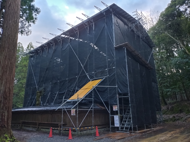 本殿工事中に雨風の影響がないように、全体を覆う素屋根が完成しました。年明けからは、いよいよ檜皮屋根の解体工事を始めることとなります。