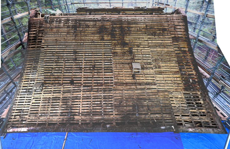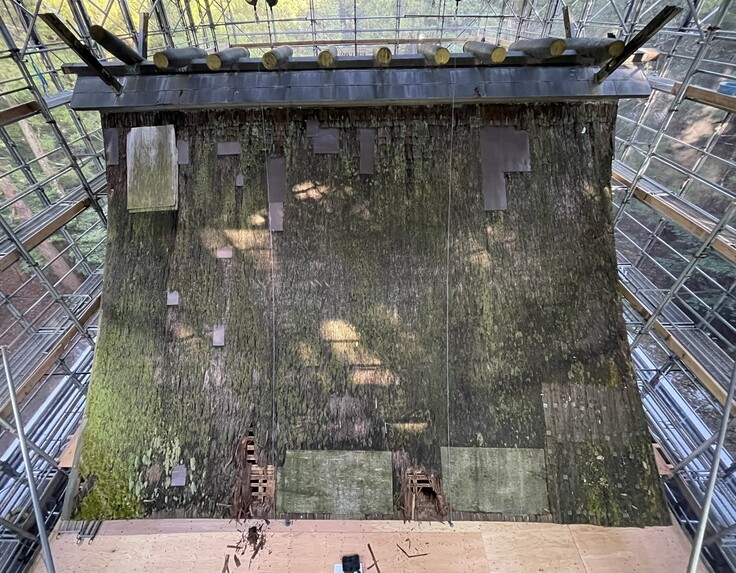 檜皮を取り除いた屋根です。檜皮の下にあった野地板(のじいた)は、適宜行われた応急処置のおかげで、再利用できそうな箇所も残っています。