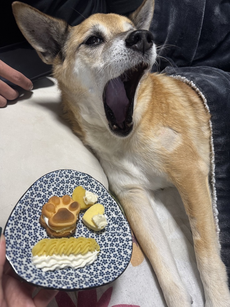 手作りのクリスマスケーキ目の前にあくびしちゃうボスくん