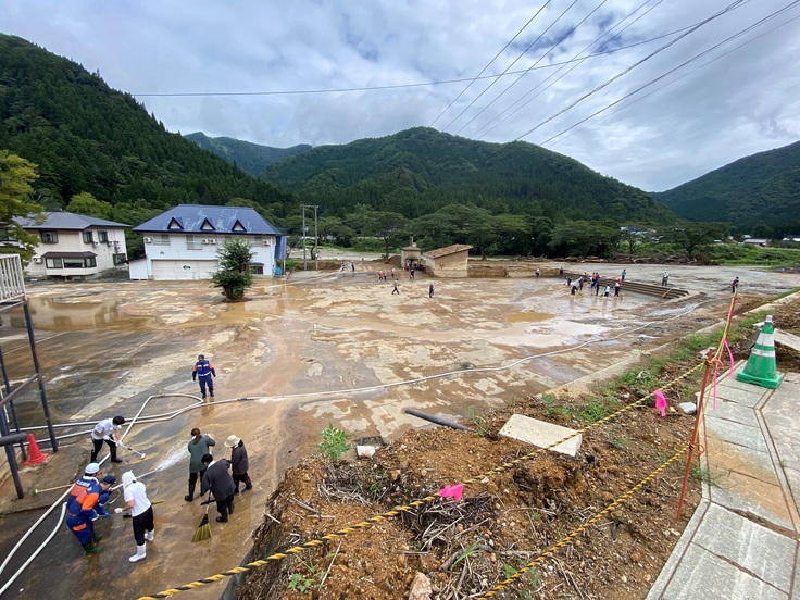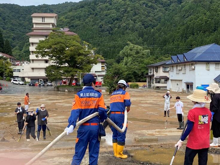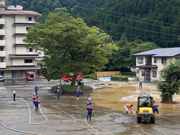 駐車場奥の大量土砂の撤去作業が大分進んだので、今度は取れきれない土砂の洗い流し作業を行いました。最上町消防団・本部、第12分団の皆様のご支援を頂いて、従業員との共同作業を行いました。消防団の方々のお力をお借りして、どんどん土砂汚れが洗い流されていきました。
