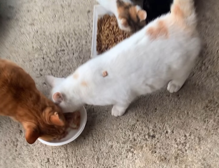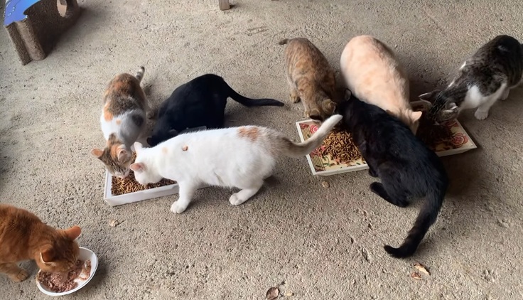 私が到着するとみんな集まって来て、ご飯を出してあげると勢いよく食べる猫ちゃん達❗