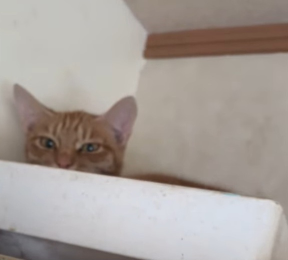昨日焦って探した茶チビちゃんは今日も見当たらず、探してみると棚の上でちょこんと座っていました。