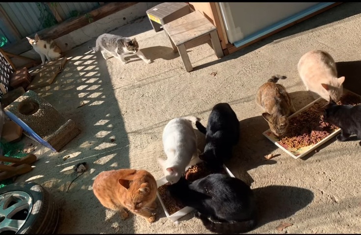いつも触らせてくれない猫ちゃん達なのですが、ご飯を夢中に食べている時だけ背中を触らせてくれます。