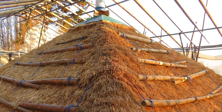 7.1.22朝日を浴びる完成まじかの月見堂屋根