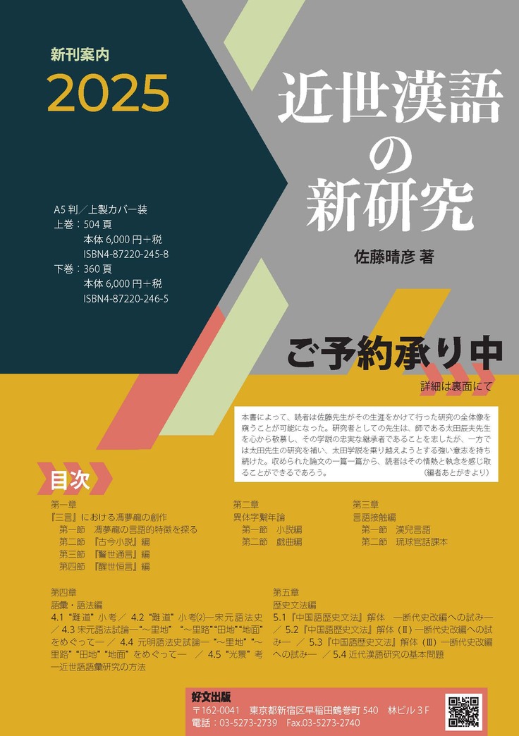 皆様からのご支援のおかげをもちまして、このたび佐藤晴彦著『近世漢語の新研究』(好文出版、2025年10月)が刊行の運びとなりました。