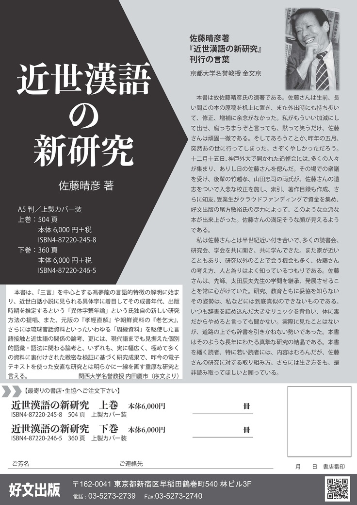 ここに「佐藤晴彦先生遺著『近世漢語の新研究』の刊行」プロジェクトを完了しましたので、報告させていただきます。