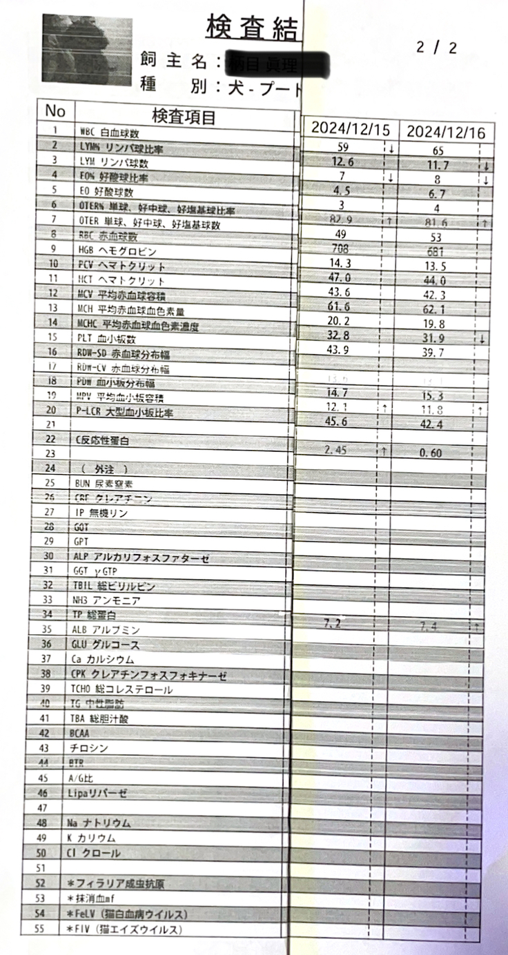 白血球、赤血球値も安定しはじめたようにみえます。このまま上向きになっていってほしいものです。