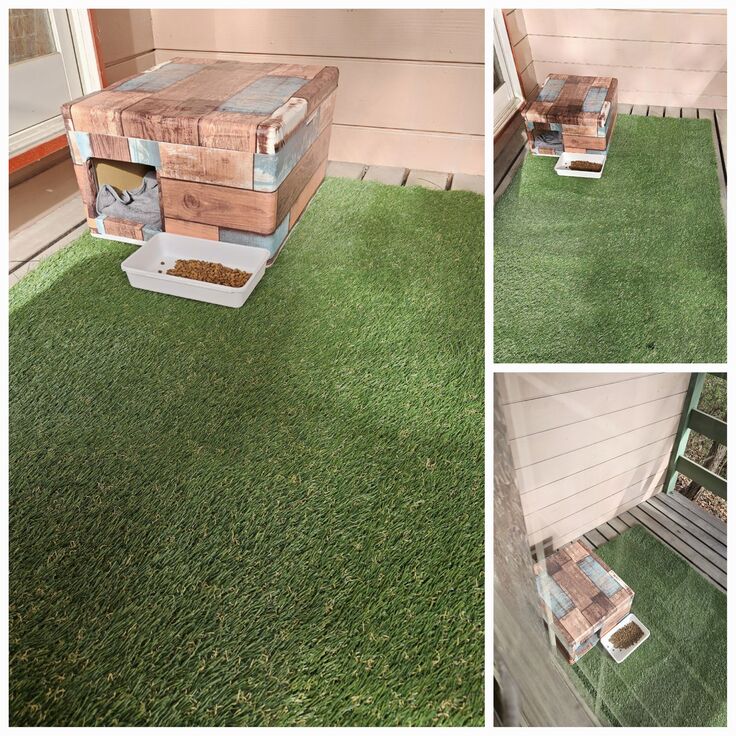 このウッドデッキは日が暮れるまでお日さまが当たるので一番暖かい場所です❗庭に使って残っていた人工芝も敷きました。