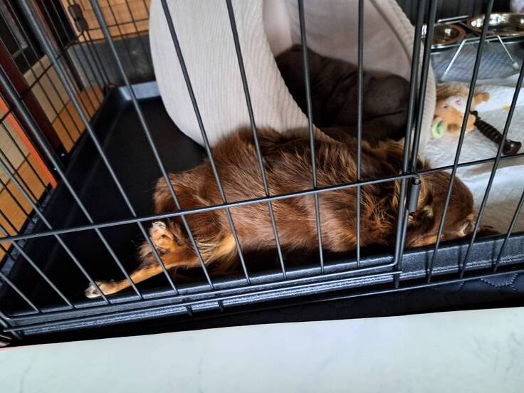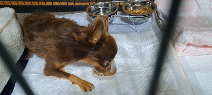 数日後の様子です。立てないため伏せの態勢で食べています。この時には痛みは引いたようでペットシーツを破ることはなかったです。