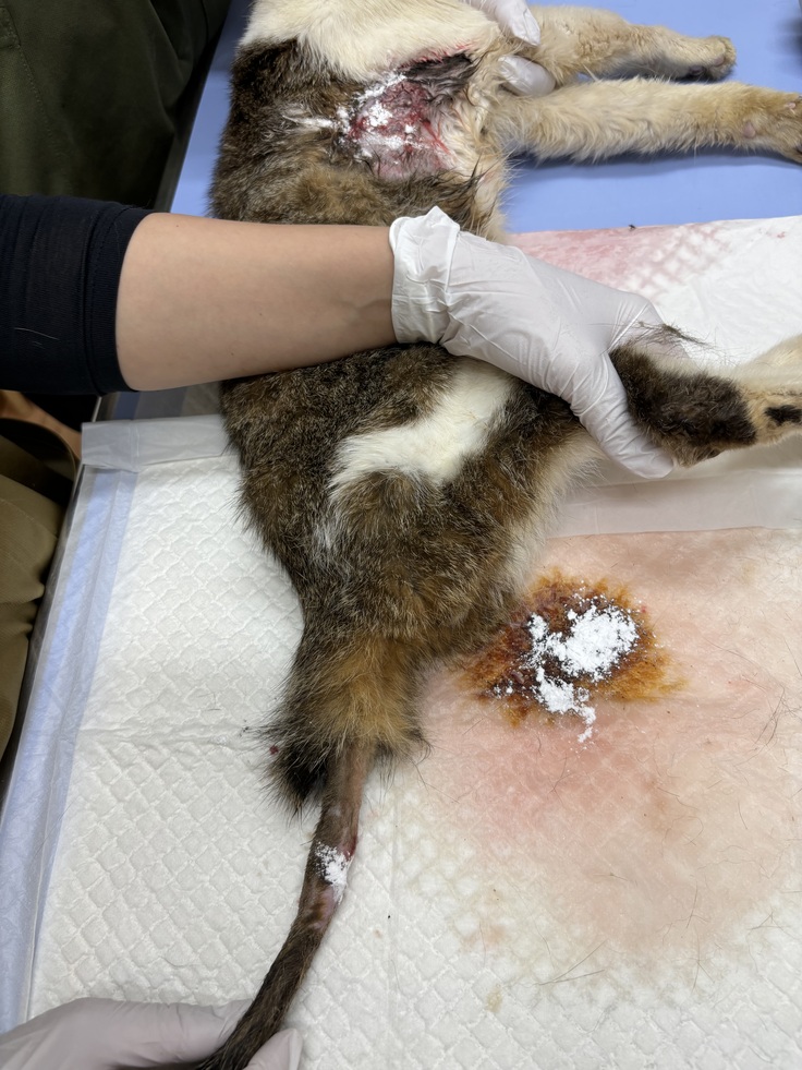 バリカンで毛を剃り腐った肉を切ってもらい、処置した後です😣茶色の液はイソジンです。