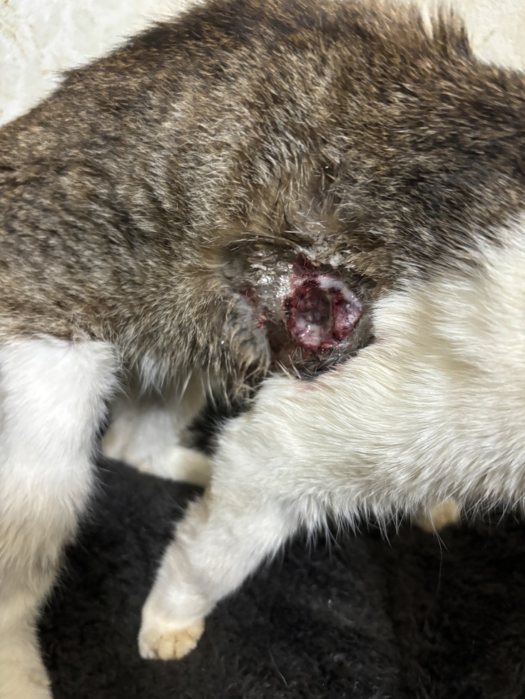 おそらく保護する前に他の猫に噛まれたか野生動物に噛まれたことからの化膿してきたのが