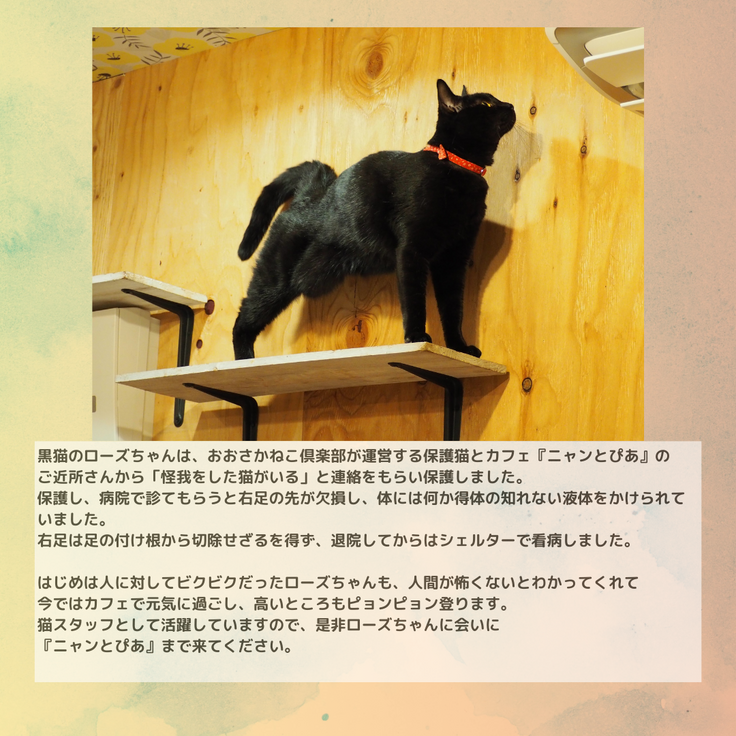 野良猫を保護し、医療を施し里親への引き渡しに毎年40~50匹ほど行っている。また別にTNRも行い、野良猫のいないまちづくりを目指している。保護猫カフェを運営、また譲渡会も開催し、啓発活動を常に行っている。SNS発信としては、ホームページ、X、ブログ、YouTube、Facebook、Instagramなどで活動を常に発信している。