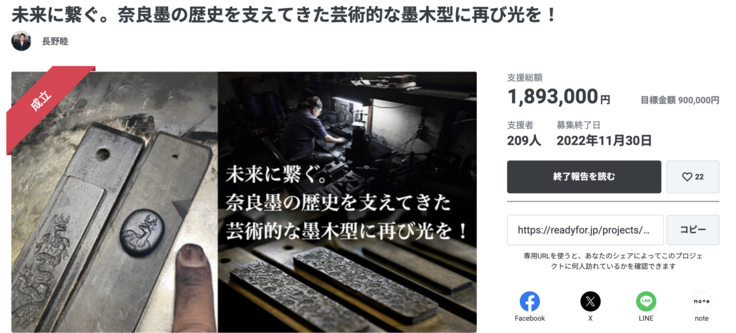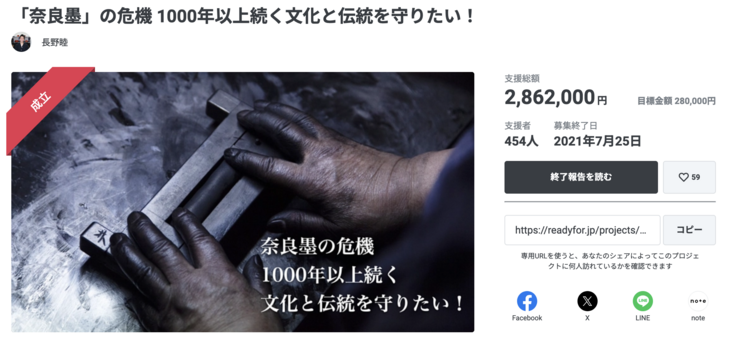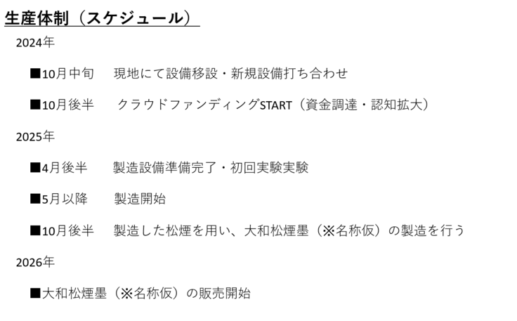 錦光園の担当者である長野睦が、消滅しかけている固形墨の材料となる国産の松煙の煤(すす)の生産・継承していく。資金の用途は生産施設・機材費・材料調達費・製造に必要な人件費。