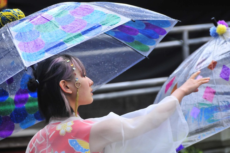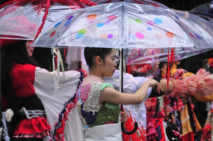 テーマは神社のお祭りをイメージした「金魚」。華やかな衣装を纏ったモデル達が、傘をさし神社を歩く非日常的な空間を創り出しました。