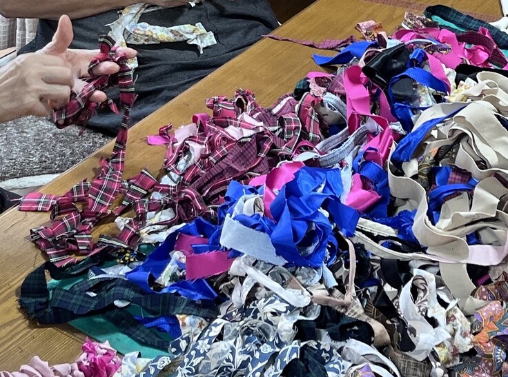 活動アイテムとなっているのは「アップサイクル」手法の一つ、「さき編み」。タンスや押し入れの中に眠っている古着や古布等を裂いて糸にし、編み物として新たなファッションアイテムを生み出しています。80歳を超えた姫達も、ワイワイ言いながら、いろいろな活動を行っています。もちろん、ファッションショーの衣装作りにも参加しています!