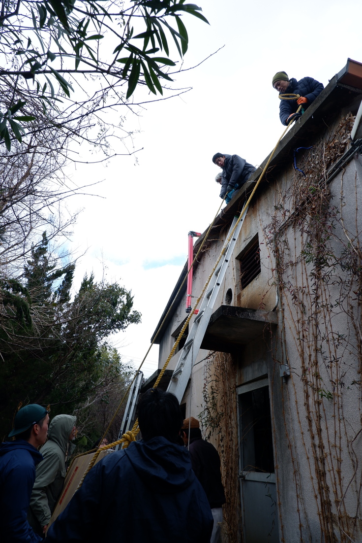 本体をロープで引きあげて、お風呂の屋根の上で組み立てました。