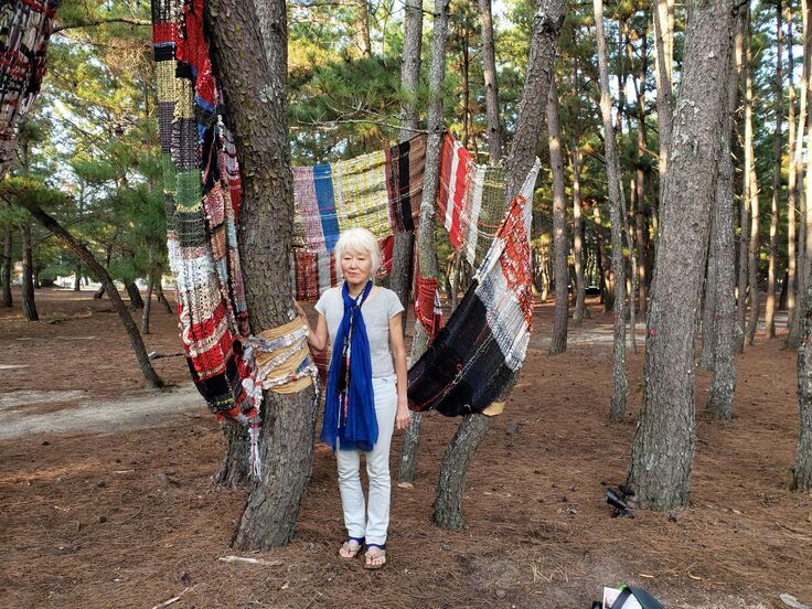 東かがわ市の白鳥神社の境内にある日本一低い(自称・登山証明書は社務所で発行してくれます)「御山」標高3.6mのすそ野に広がる約1500本の松が自生する「白鳥の松原」で野外展示をしておりました。30m以上ある織物で材料もさまざざま。ケーキに使う銀紙や何でも織れるアーテイストです。