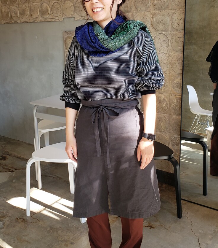 (3)と同じストールを巻き方を変えてくれました。規則的な柄でないので違うストールのようです。