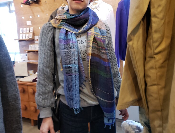 shikiさんのお客さんが巻いてくれました。男性が巻いているショールです。まったく雰囲気が変わります。