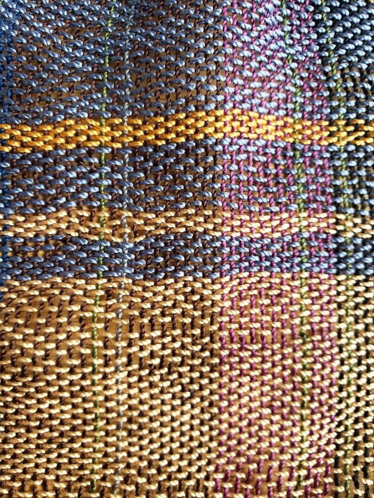 織物は経糸と横糸を交差させ、布に織り上げます。つづれ織りの糸で通常の織り方で織ると、固く厚みのある布となるので、豪華なマフラー・ショールは出来ますが、用途が限られてしますので、友人の織物作家さんの協力をいだだき、新しい織り方ができました。和装だけでなく、服でもカジュアルでも違和感がありません。通常の絹100%より空気が入るふわっとした織り方なので、体温で布が暖かくなり、今の時期でも薄いのに非常に暖かいです。手織りですので高価なものになりますが、四季を通して使用出来、また、薄いのでコンパクトになり、持ち運びも荷物になりません。これもなかなか、画像では肌さわりなどが伝わりにくいので、拡大画像を撮ってみました。また、手織りで特にデザインは決まっていないので、世界で1枚だけのものです。