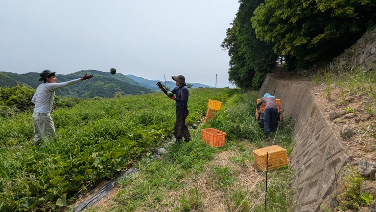 機械での収穫が難しいため、どうしても手作業中心になります。特に通路が狭く、機械が入れない箇所では、人から人へかぼちゃをパスして運ぶなど、工夫しながらの作業でした。