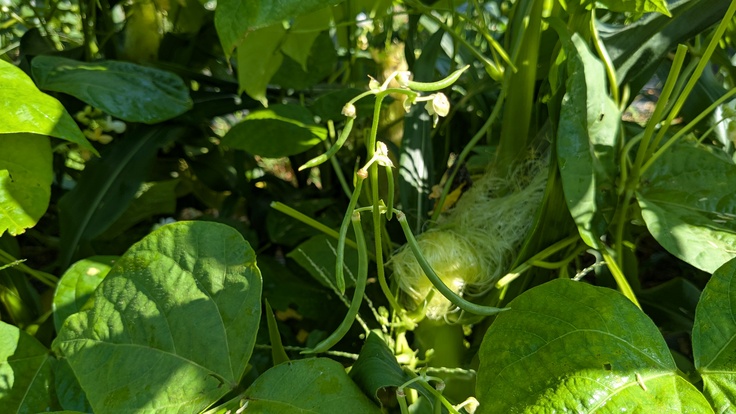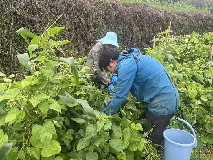 さやいんげんは、とうもろこしにしっかりと巻き付いて育っており、一つ一つ丁寧に手で収穫していきました。