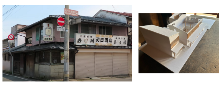 現在手掛けられているのは、「旧和田酒店」と「旧川村時計店」店舗部分を、“総合商用店舗”にする、構造改修工事です。改修工事を行っている物件前には、地域の方々に改修と取り組みが伝わるように、仕上がりのイメージを見ていただくための全体模型と、建物の木組模型を展示されています。