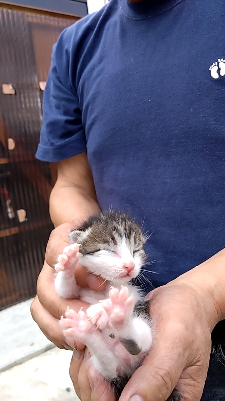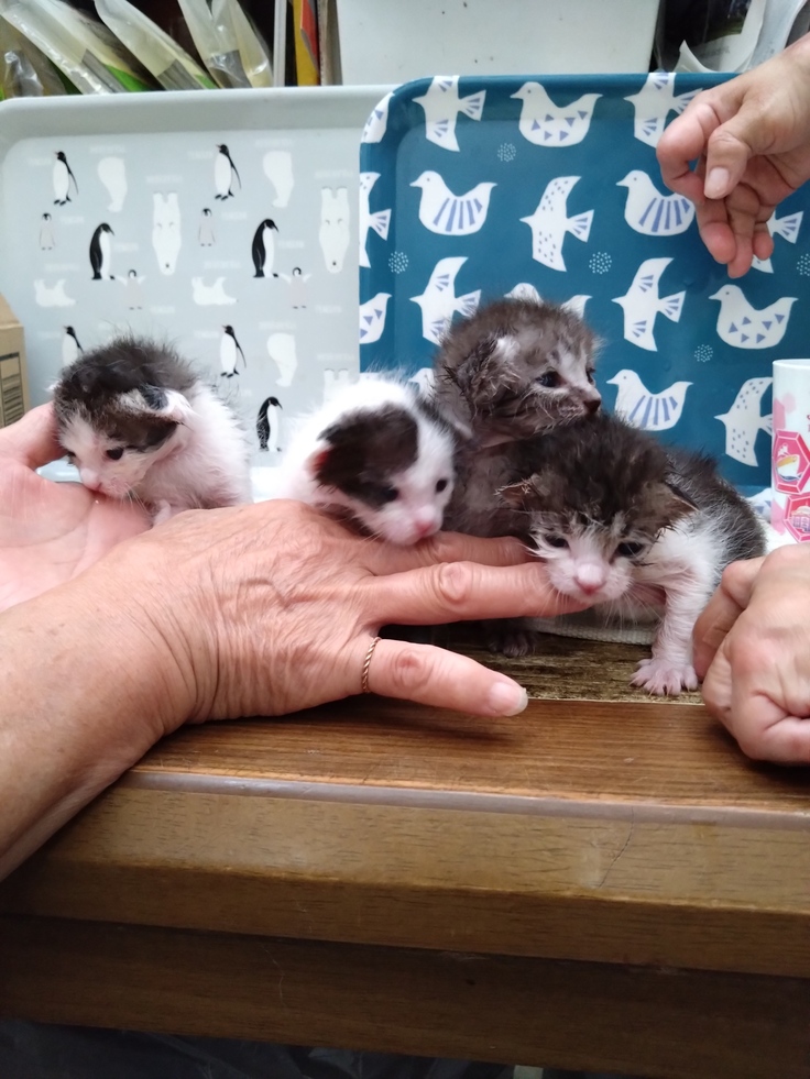 くまんちの近所の田んぼ道に、まだまだ乳飲み子だった4匹の赤ちゃん猫が捨てられていました。たまたま通りかかった犬の散歩中だった方が保護してくださり、縁あってくまんちへやってきました。