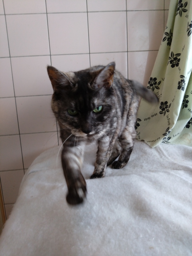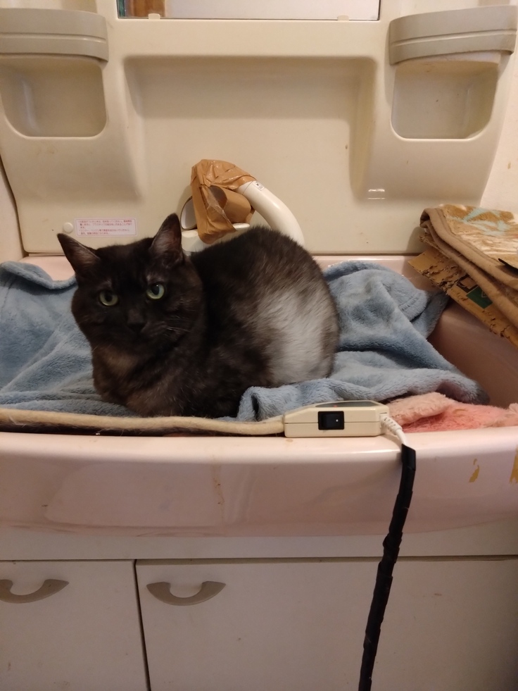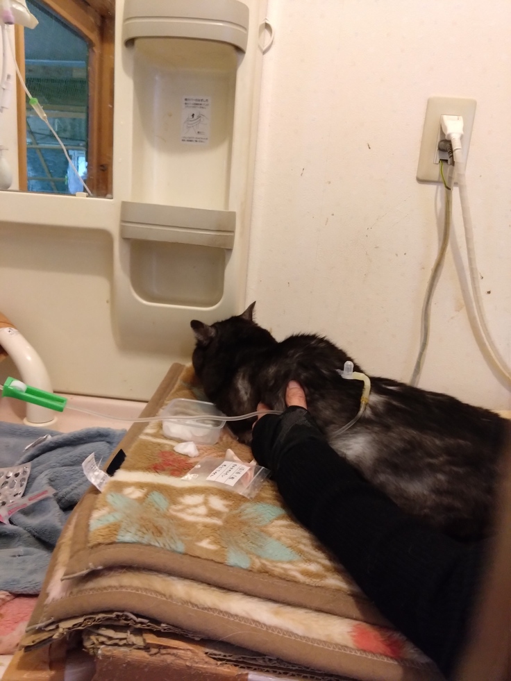 クロちゃんは1年前に腎臓が悪いと診断され、一日おきに背中に点滴をしています。食欲も戻り、体重も増えてきました。