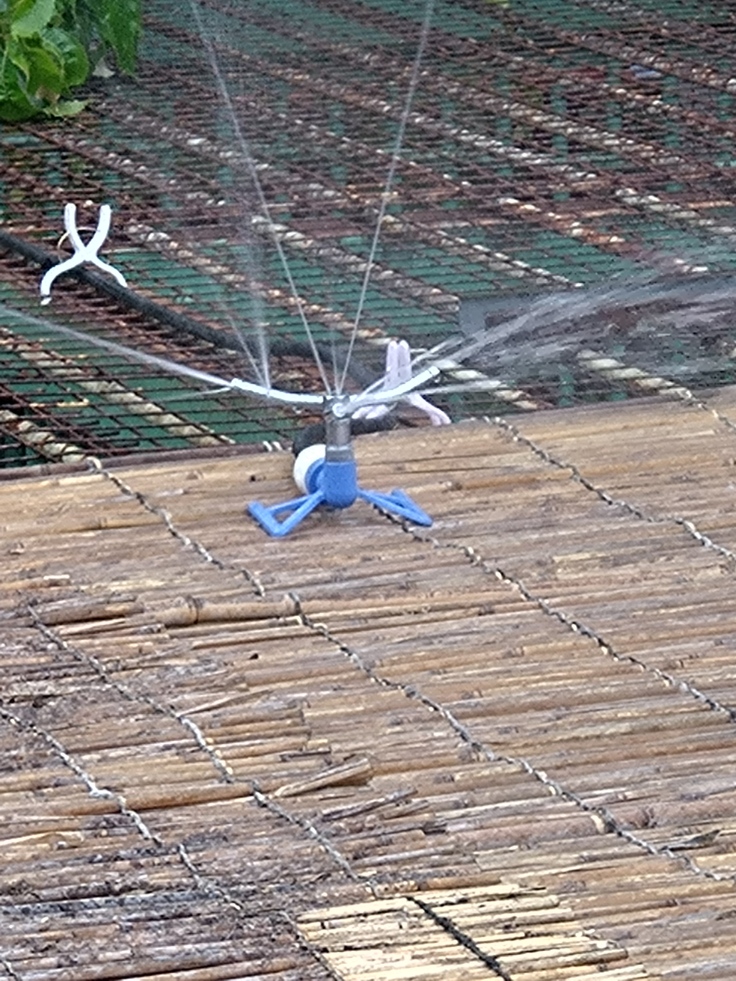 犬猫部屋にはエアコンがありますが、クマ舎には屋根にヨシズを張り、スプリンクラーで屋根に散水し、3年前からは農業倉庫用のクーラーを購入し、冬眠部屋の食事用の小さな小窓からダクトホースで涼しい風を送っています。