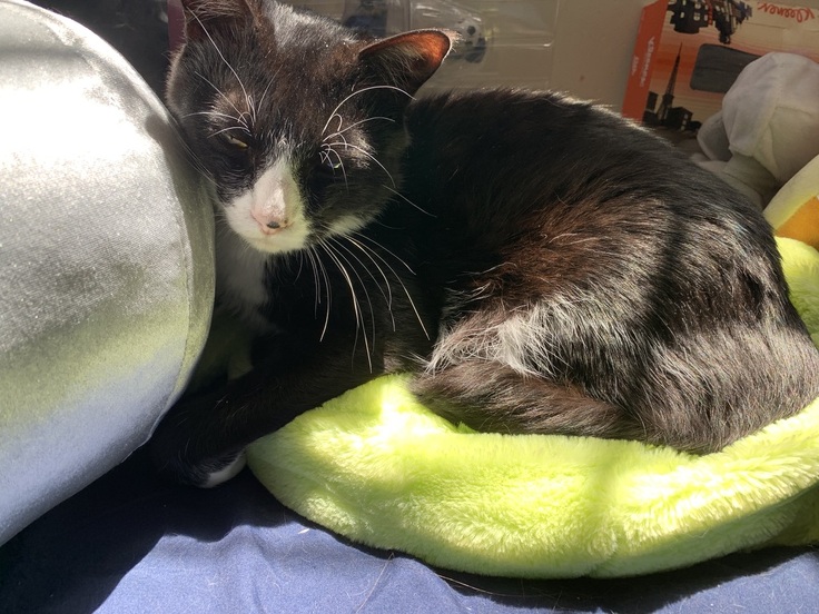お気に入りのクッションにもたれかかって日向ぼっこをしていました!