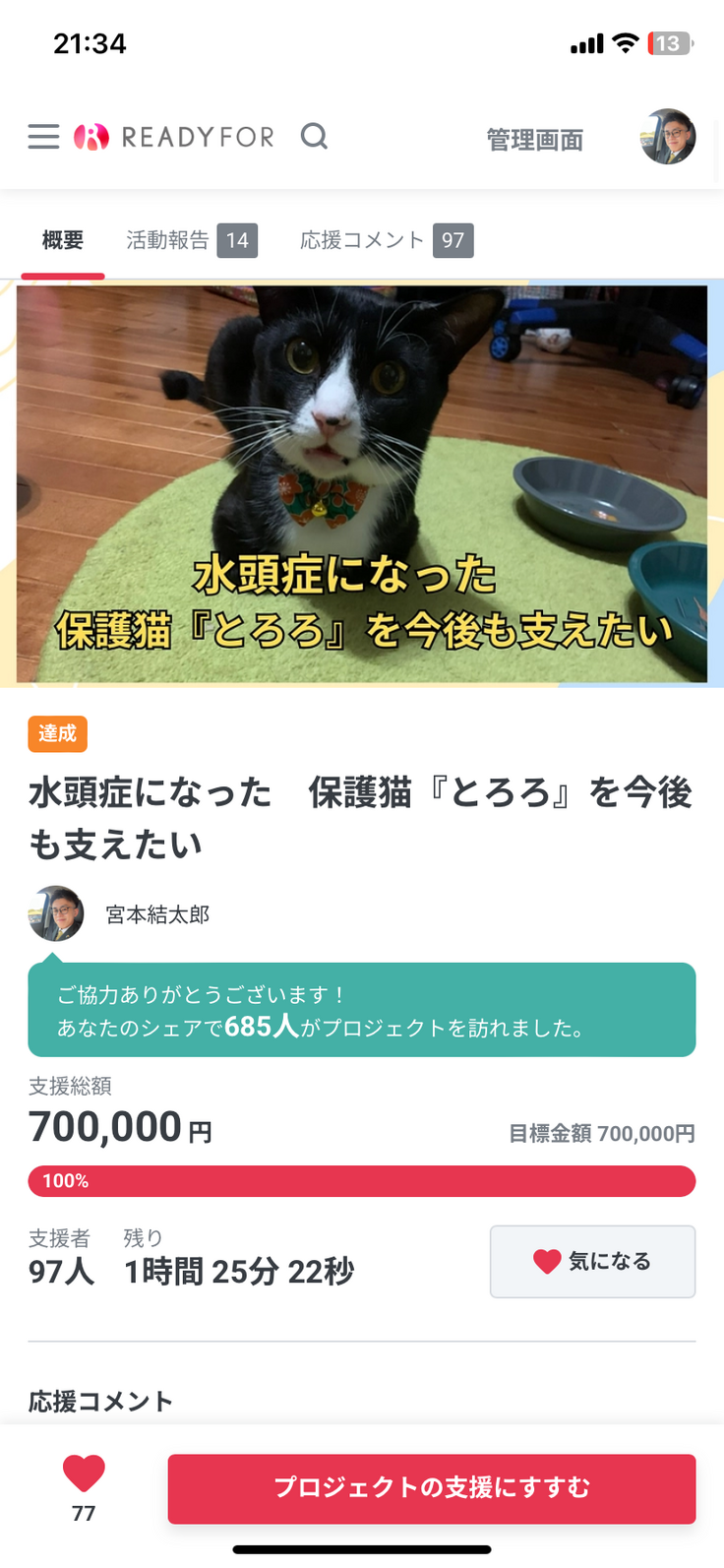 ただいま目標にしていた700,000円を、お陰様で達成することができました!