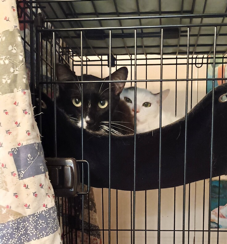 とても警戒、緊張しています。片時も離れない兄妹猫さんで支えあっています。夜中にご飯を食べています。