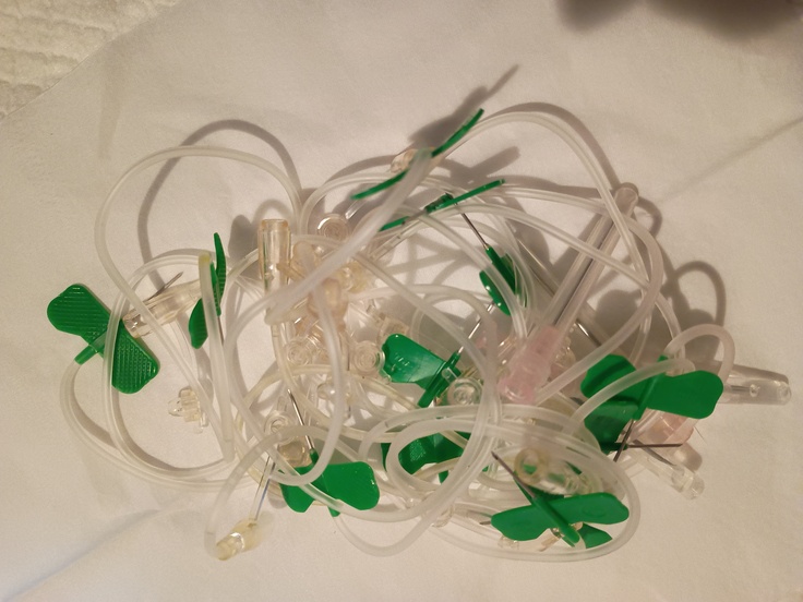 闘病の跡、沢山の点滴針は今日動物病院に医療廃棄物として持って行きます。