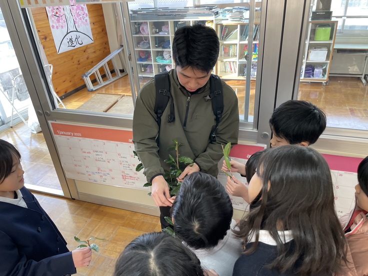 せっかくなので、実際に茶の木を持って行き、子どもたちに