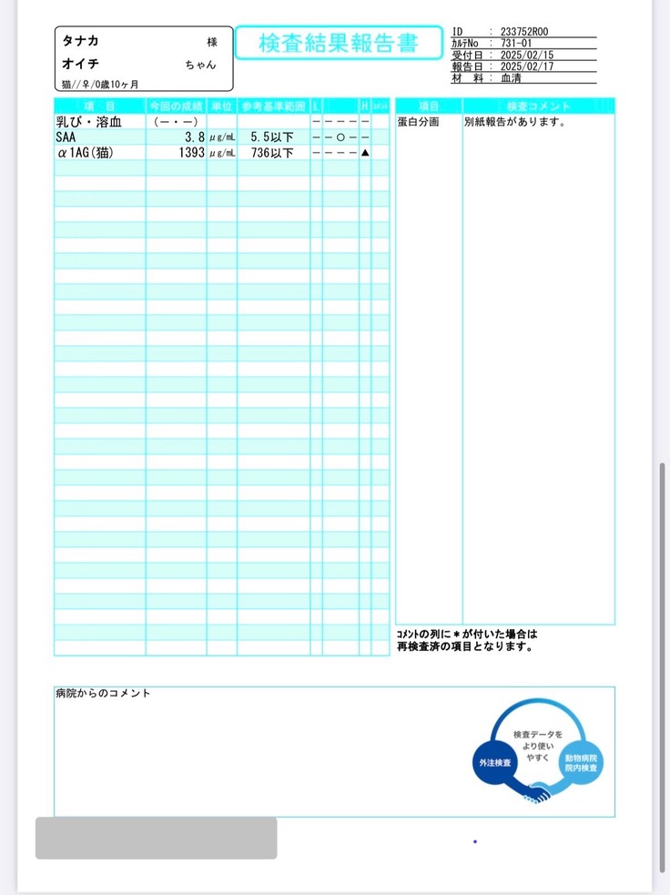 SAA(炎症の数値)も、前回値(26.8μg/mL)から下がり
