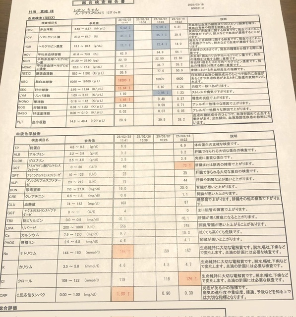 体重、血液検査、レントゲン、エコーの状況は以下の通りです。